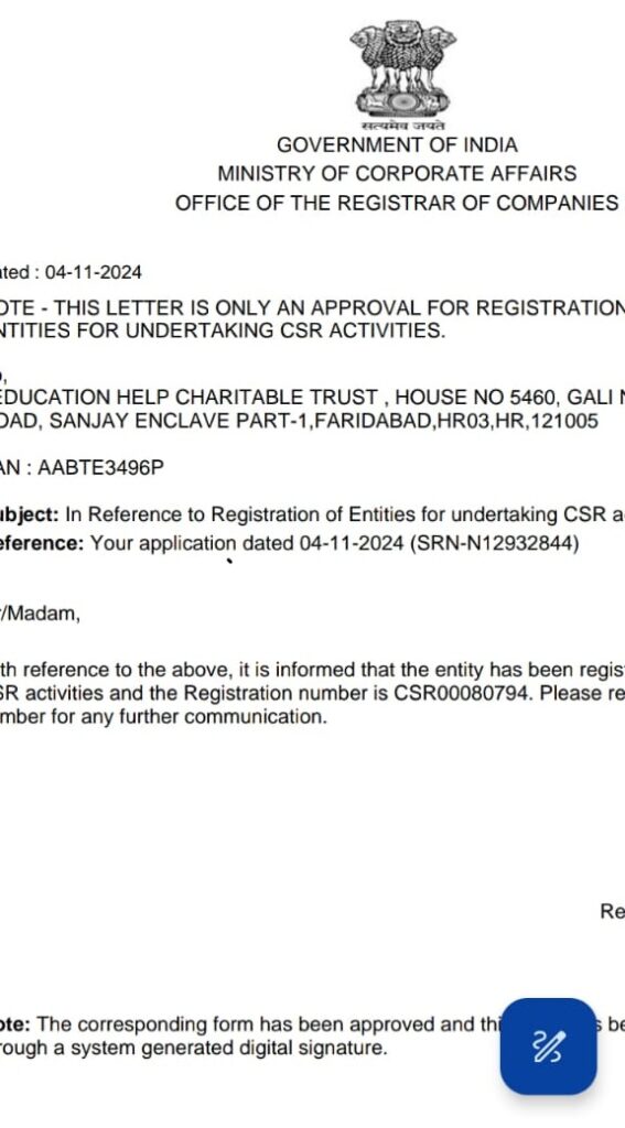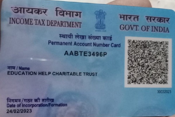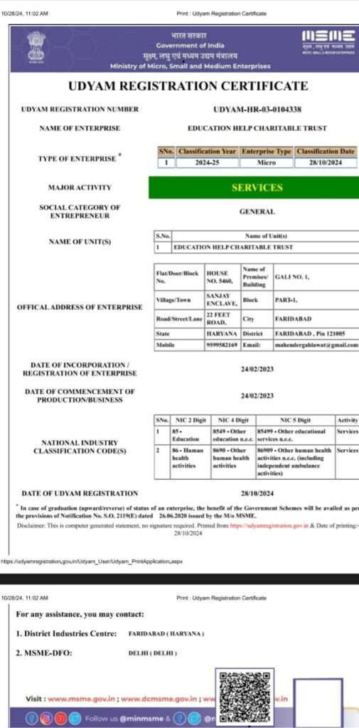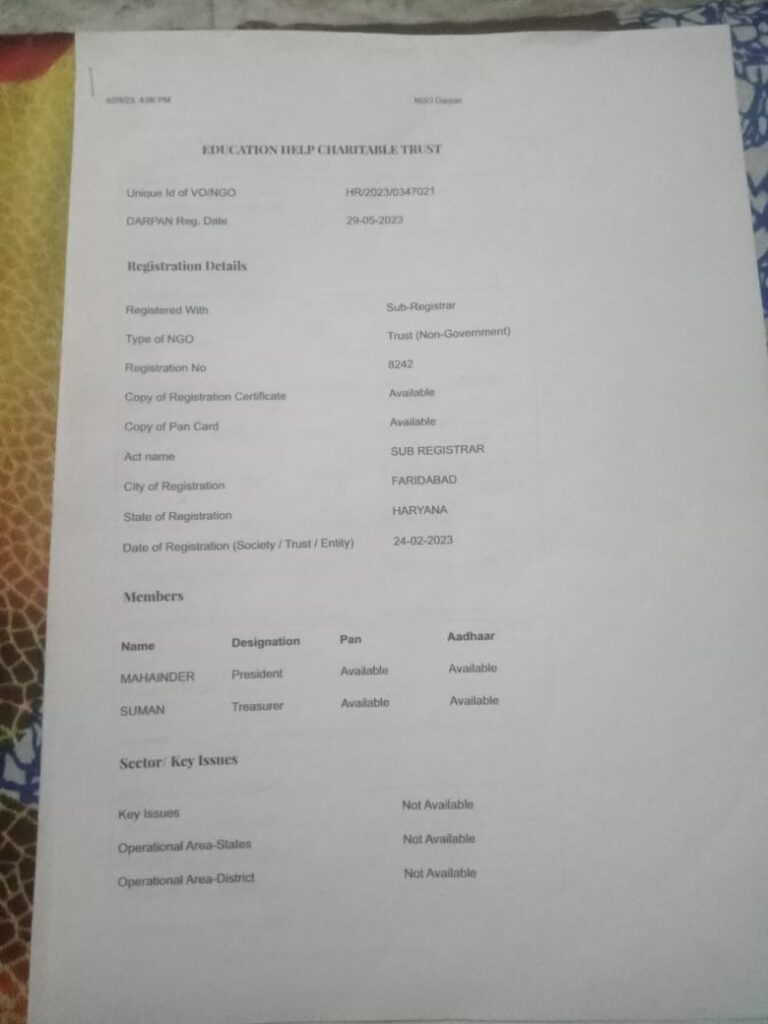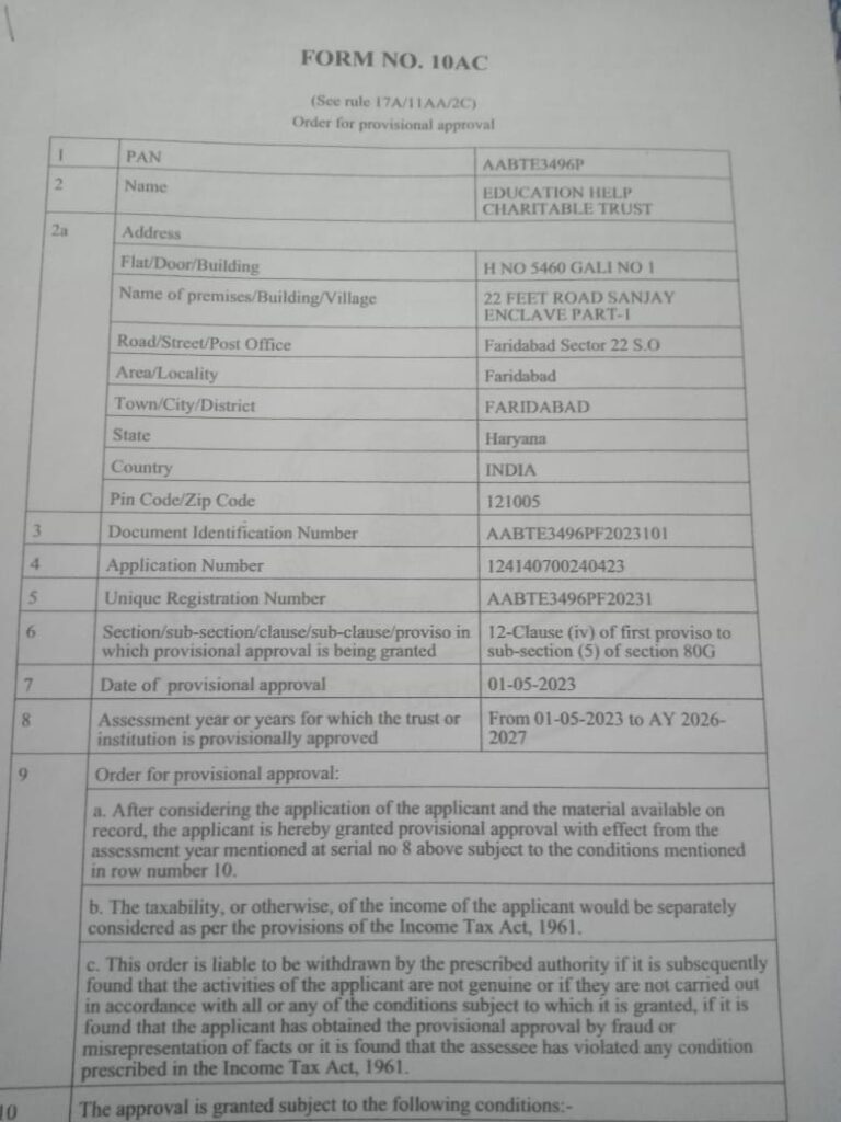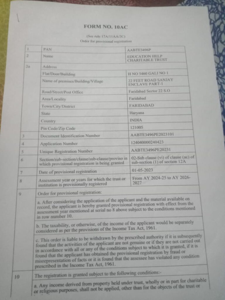 EDUCATION HELP CHARITABLE TRUST Regd. no. 8242 Head Off. : Tigaon Road, Near Shamshan Ghat, Ballabhgarh, Faridabad 121004, Haryana. M: 9599582169, E-mail: ehct2023@gmail.com Our Legal Documents Here All Legal Documents